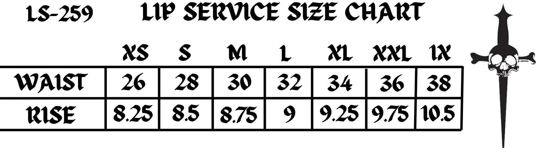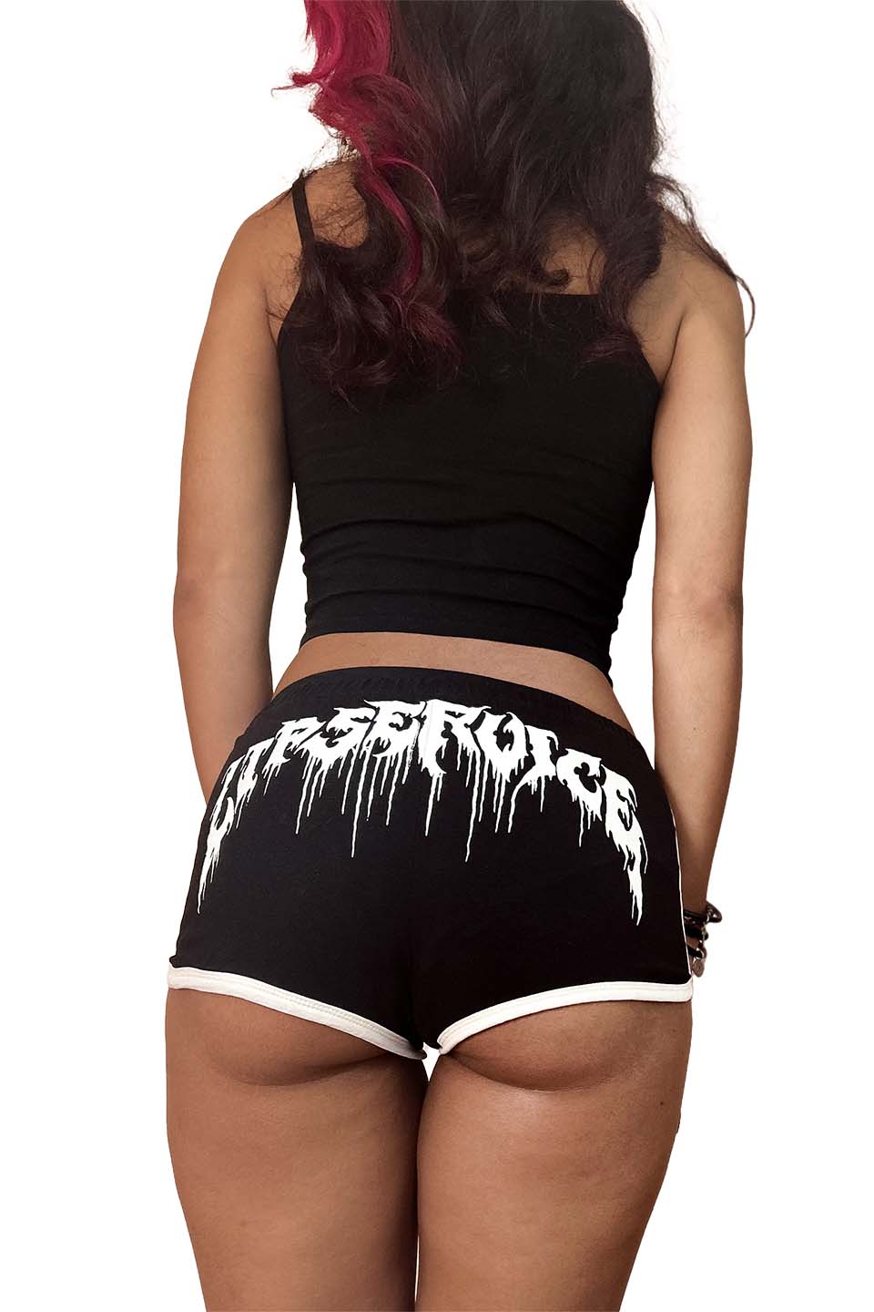 Black fitted booty shorts with white Lip Service logo on back and small white dagger on the front.