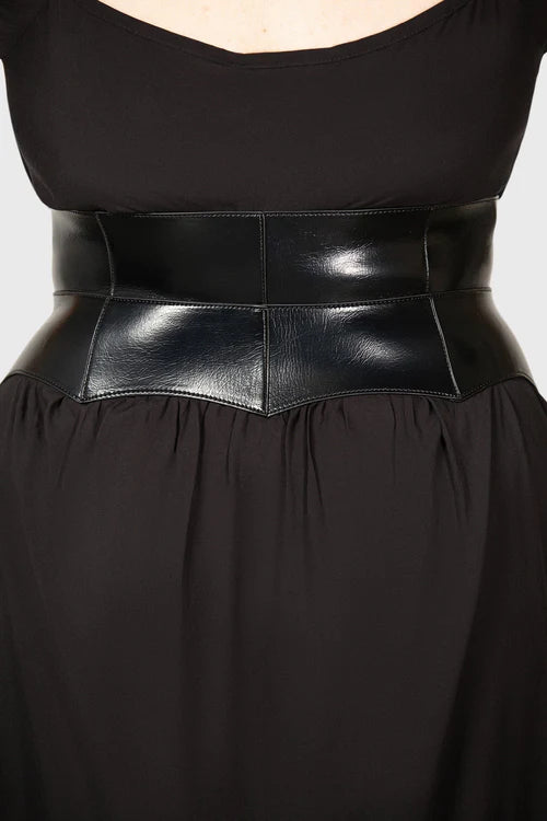Black vegan leather underbust corset with adjustable lace up front closure, bat wing inspired scalloped edge with metal hardware.
