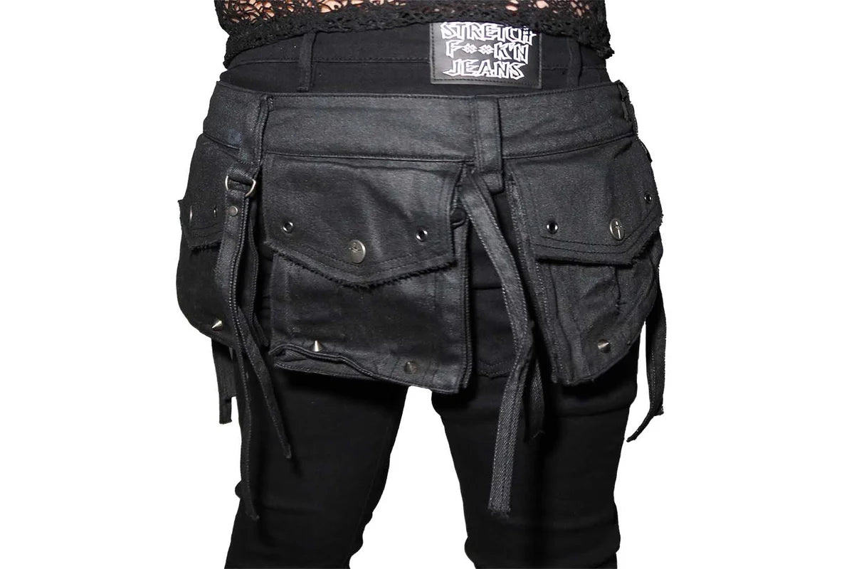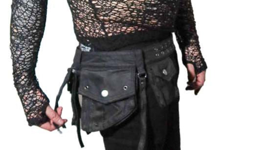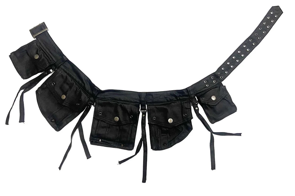 ONE SIZEFEATURES:Black waxed Thunderdome belt has 5 pouches and D rings.MATERIAL:Waxed twill.DIMENSIONS:Fits hip sizes 30-44".Color may look different in real life based on photo lighting. It can also look different based on the device you're viewing the photo on.