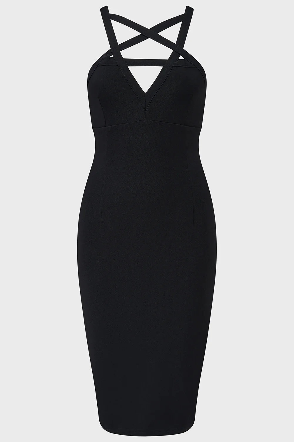 Black soft feel super stretchy woven dress with wiggle style bodycon, midi length, pentagram chest cut outs, back slit and back zip fastening.