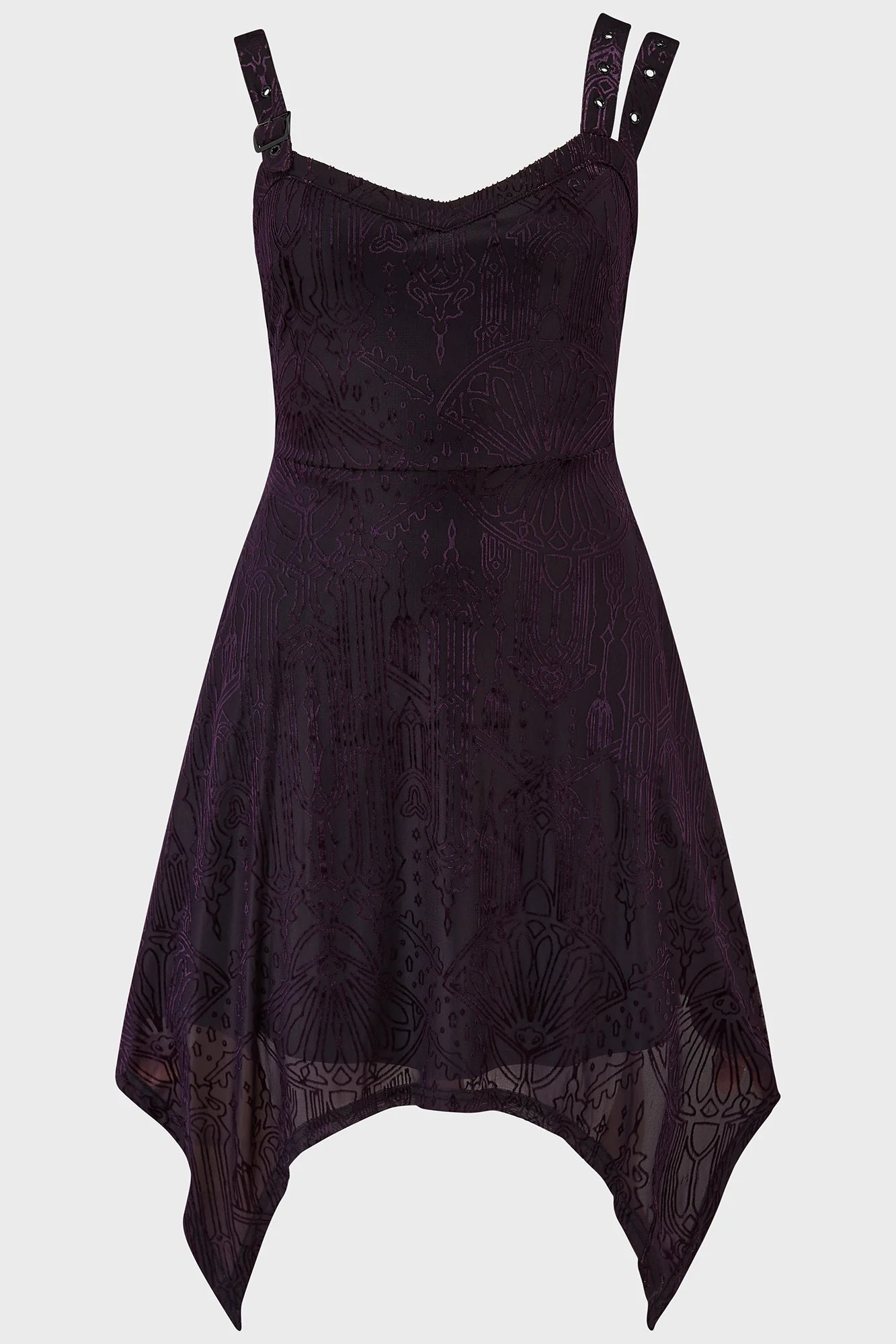Black burnout stretch velvet purple and black dress with cathedral print all over, shoulder straps, mini length, semi lined, double strap on one shoulder, buckle and eyelet detail on strap and uneven hem.