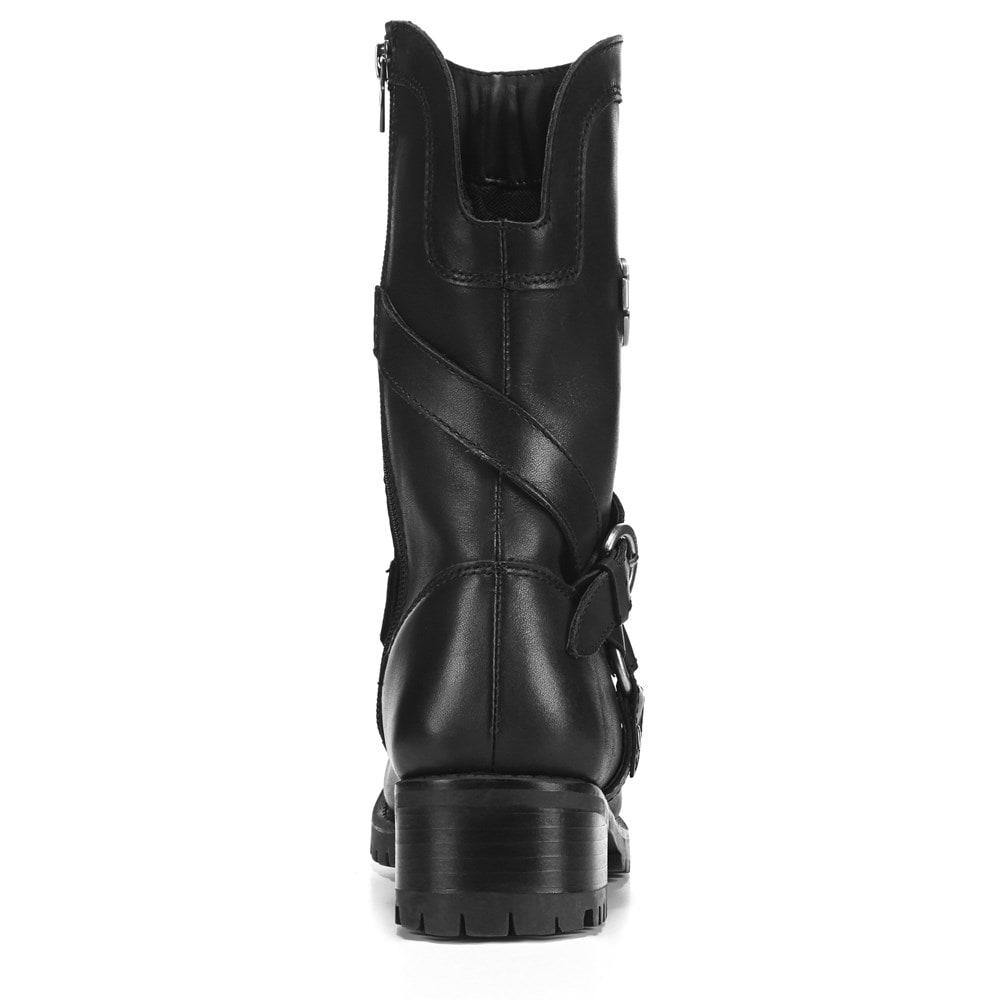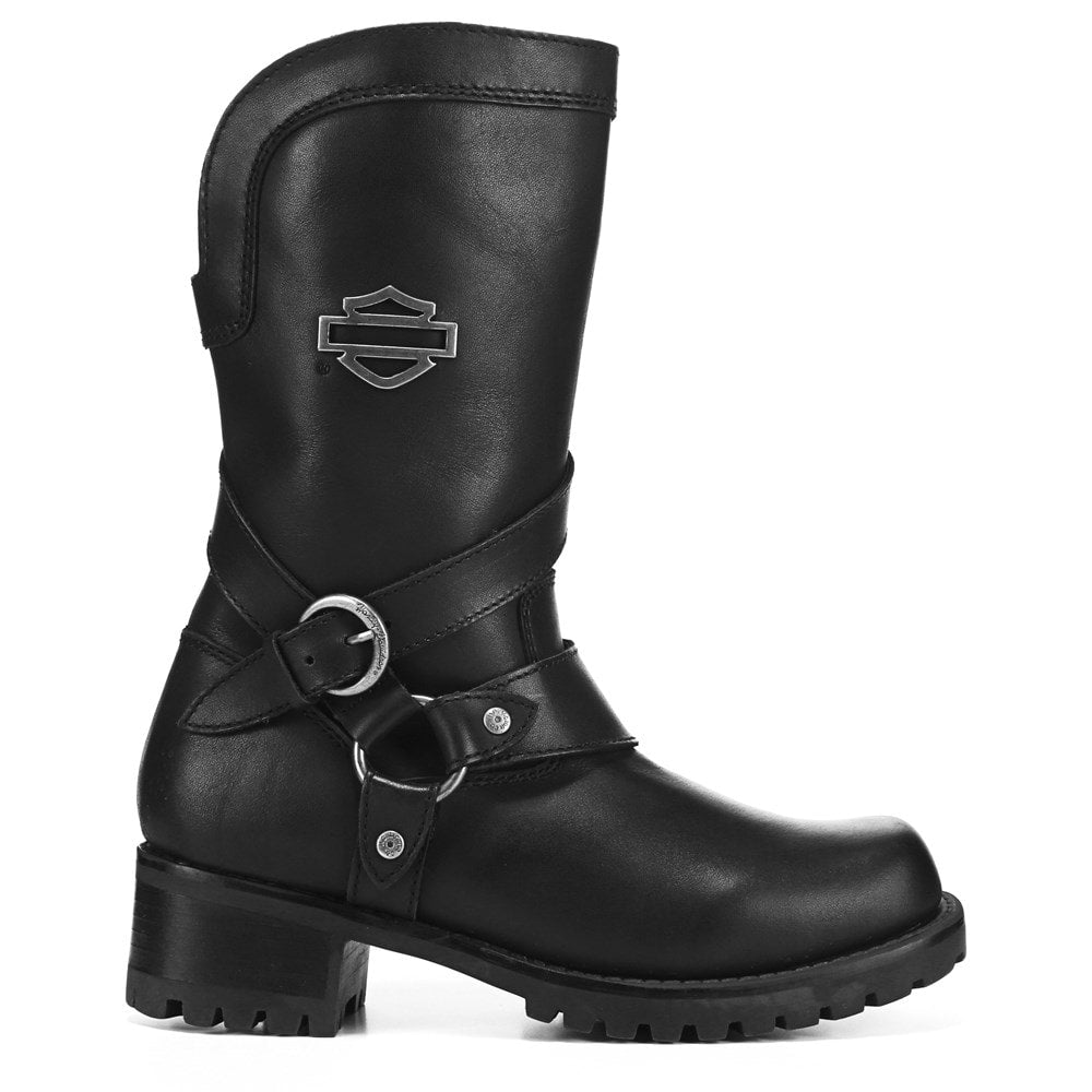 Black leather upper with round toe, side zip, durable cement construction, mesh lining and durable rubber lug traction outsole.