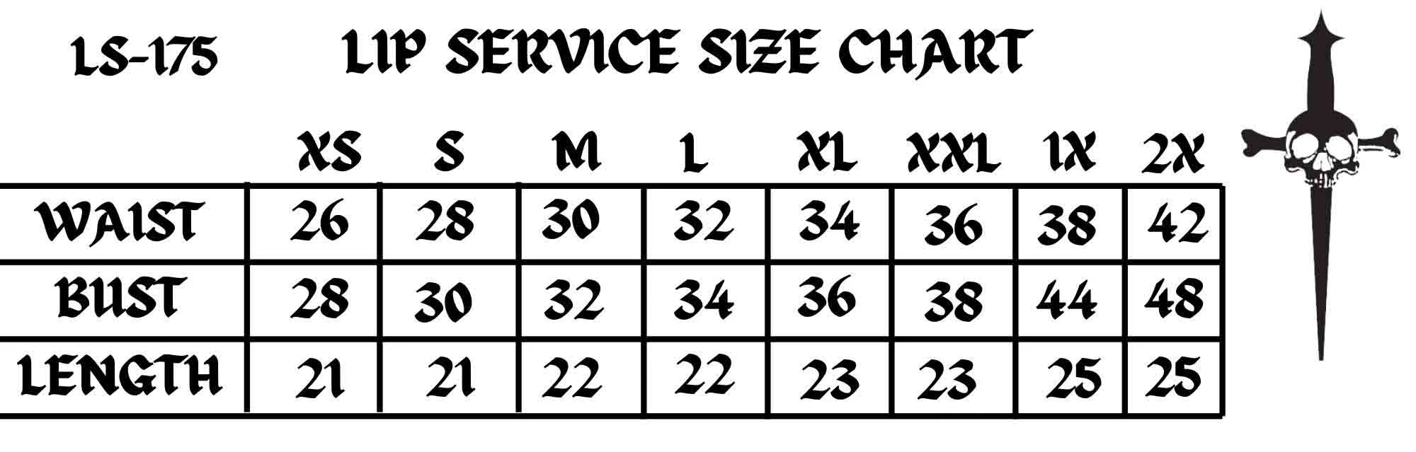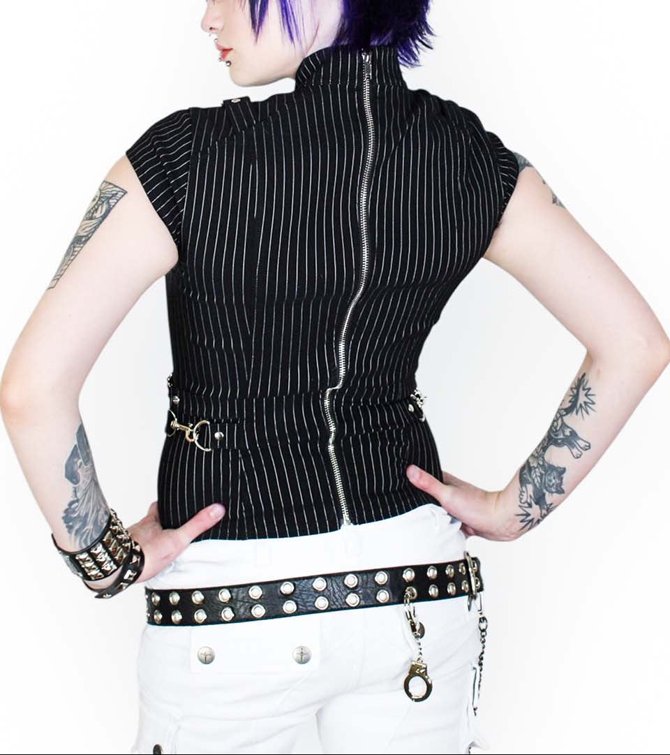 Black pinstriped bondage hook and strap top with padlock collar, cap sleeves and front cut-out detail. Top has full back zipper. Lock comes with keys.