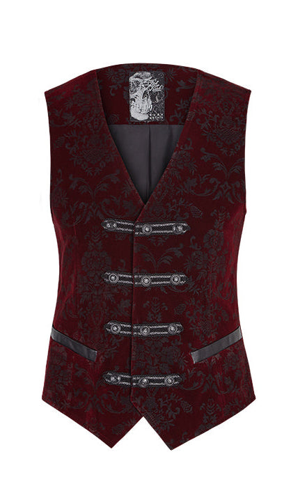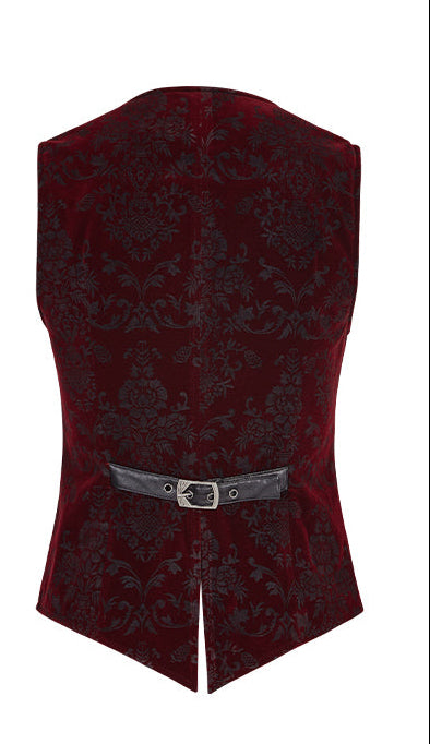 Red waistcoat vest with bruised velvet pattern and black roses. Placket has silver buttons, and vest has two pockets. Vest has adjustable belt and buckle on the back.