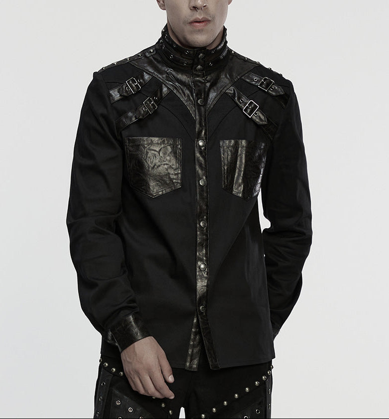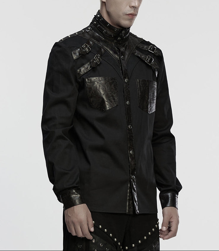 Button-up shirt with buckle strap details, front pockets and high collar.