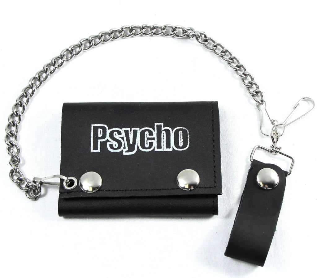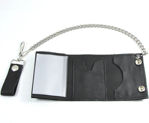 Black tri-fold wallet with silver "Freak" text on front, with snap closure, 6 page picture insert, credit card slot, 2 pockets and a detachable chain with leather belt loop snap.