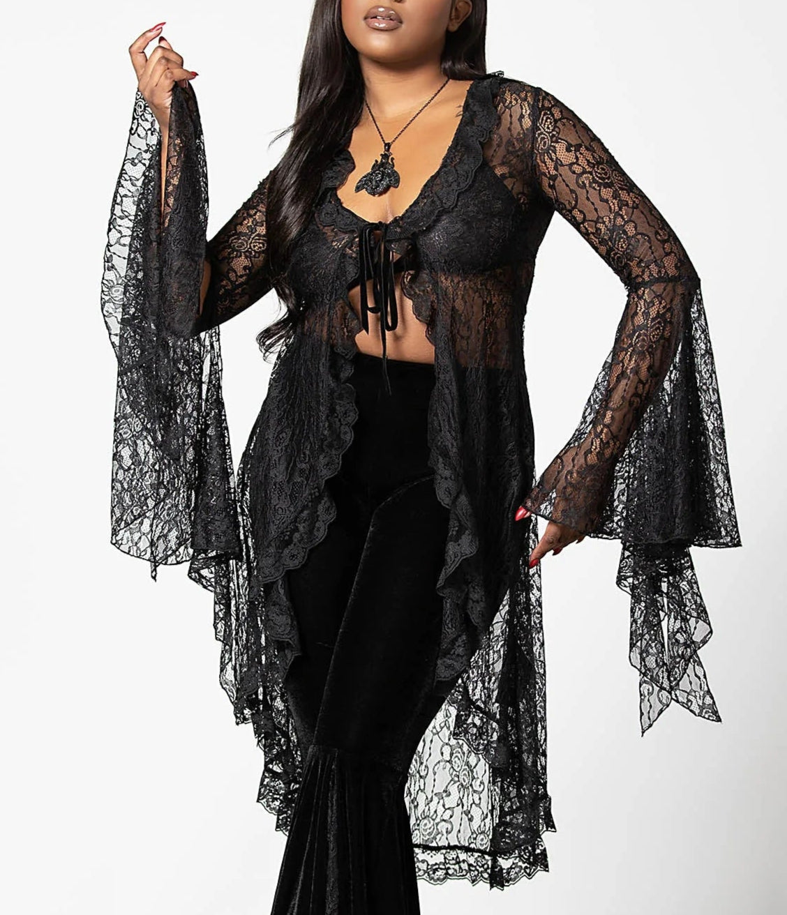 Black slight stretch sheer lace fabric duster with statement bell sleeves, ruffled hem detail and front tie closure.