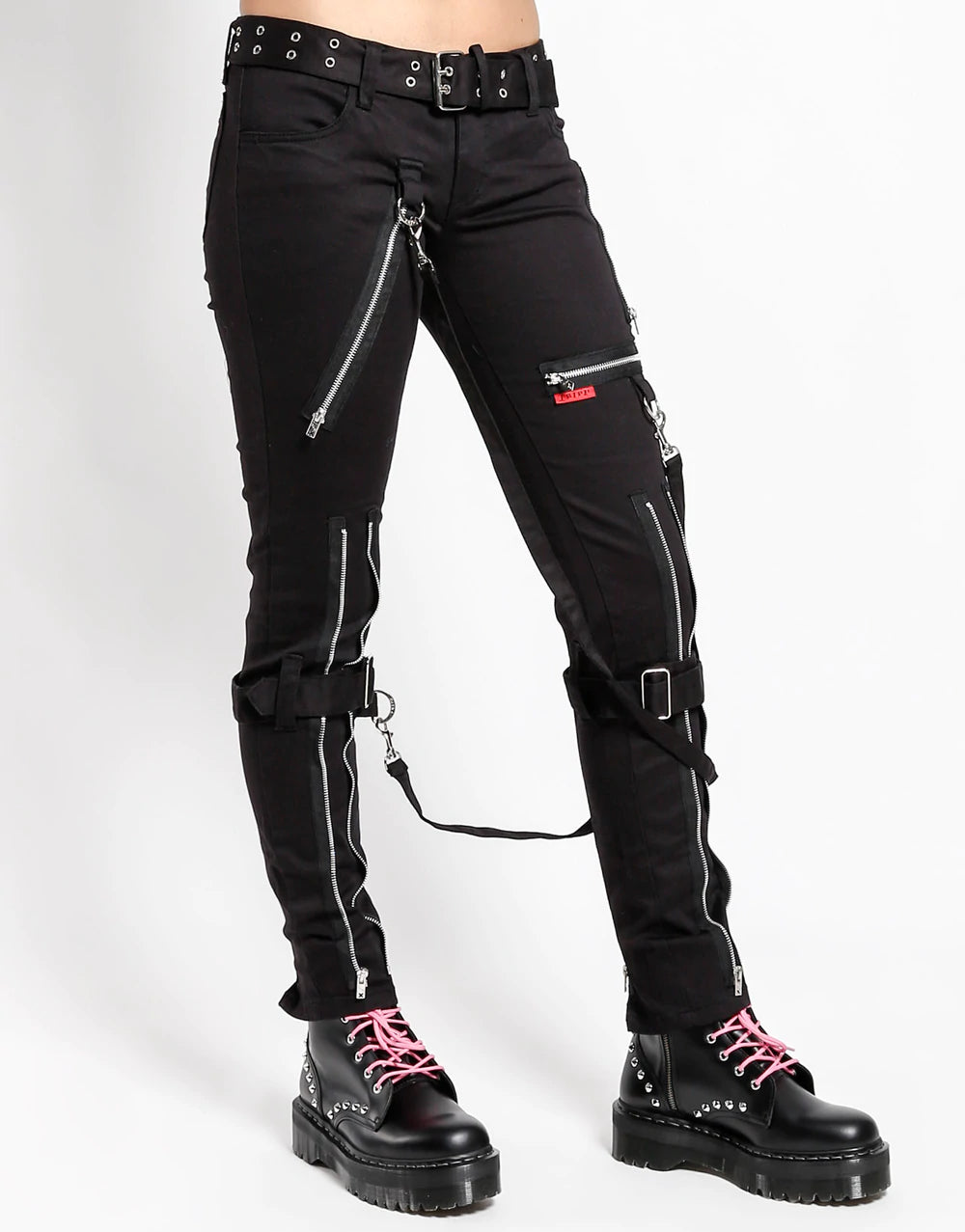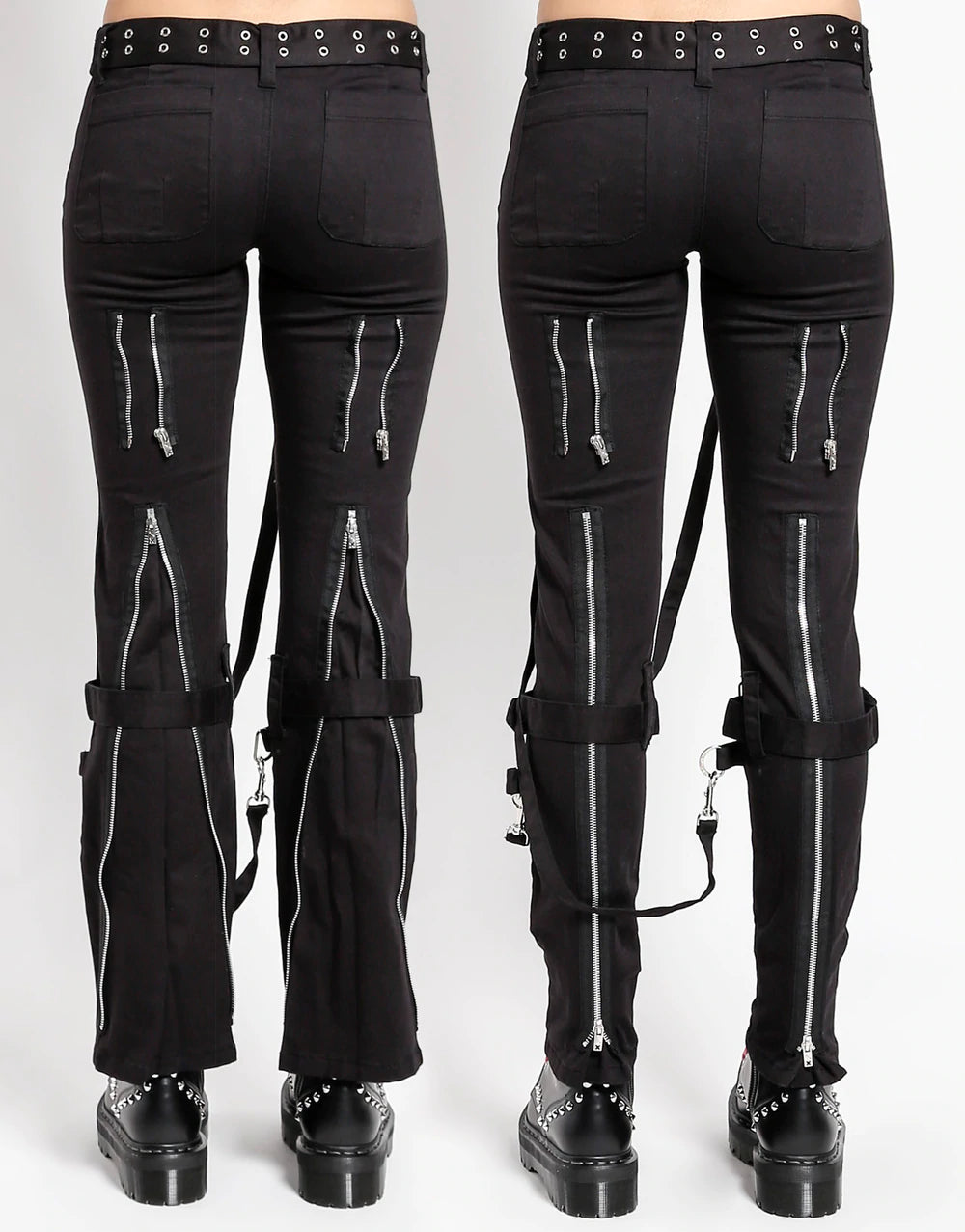 Classic slim bondage pants with removable straps, all over zipper detail and grommet accented belt. Pant legs can be zipped for skinny and unzipped for a flare, topped off with a zip fly and button closure.
