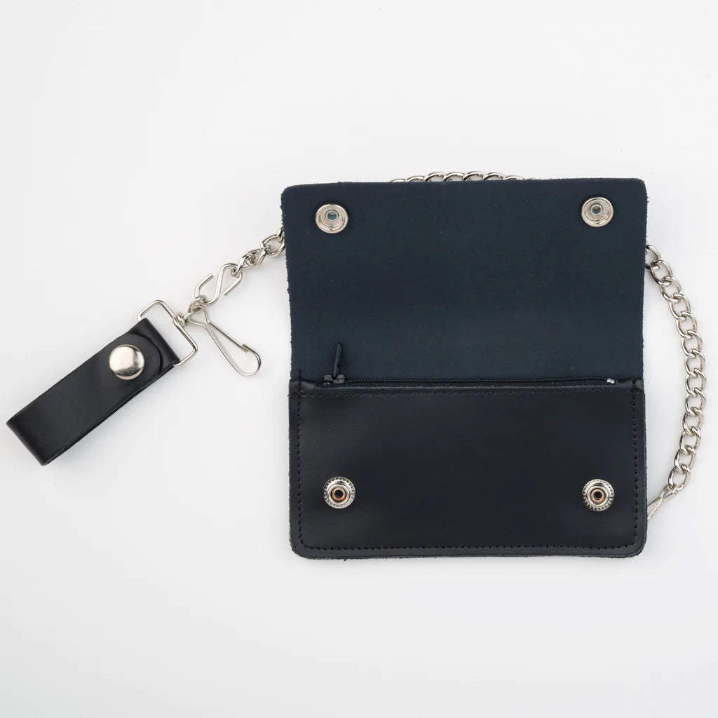 Black leather long wallet. Wallet has a snap closure and an interior zippered pocket. Wallet has detachable chain with leather belt snap clip.