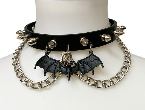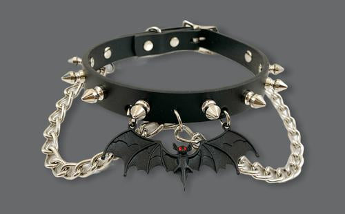 Black collar with silver spikes, silver hanging chain, and black bat with red eyes hanging from the front center. Collar has adjustable buckle closure.
