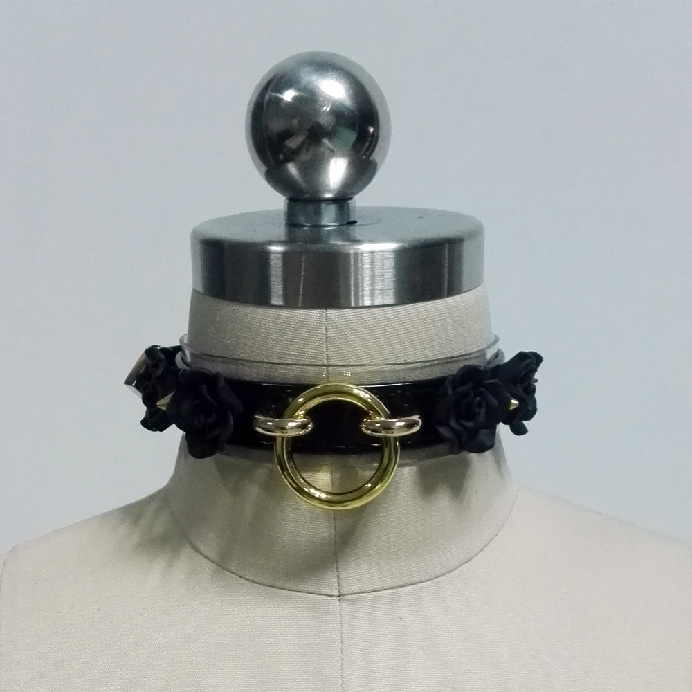 Black vegan leather and clear vinyl choker with gold colored O ring on the front, black rose details all over choker and gold tree spike details on choker. Choker has adjustable belt closure.
