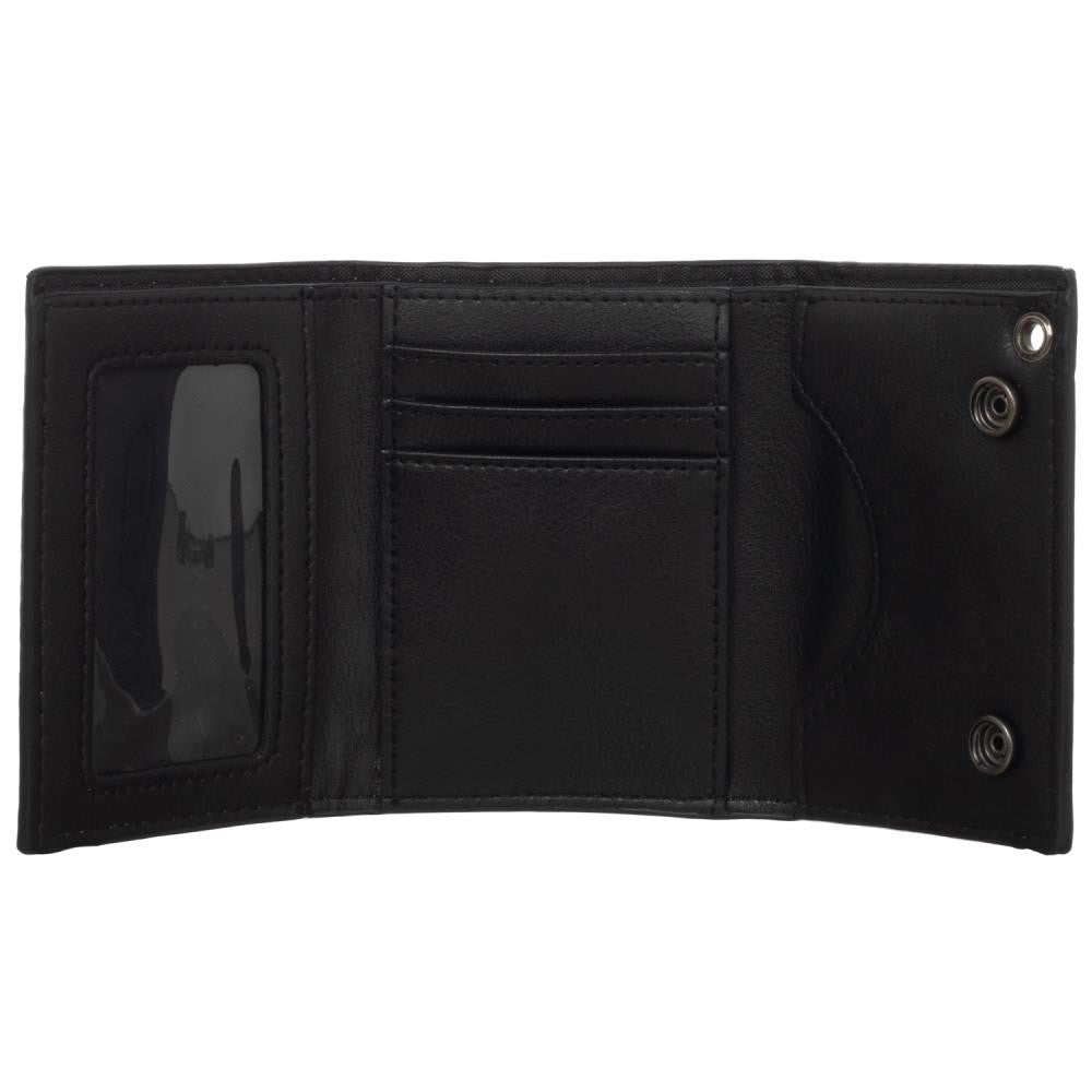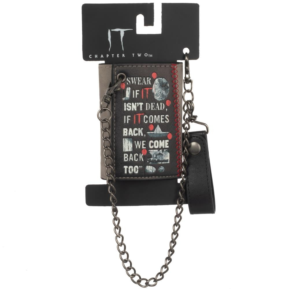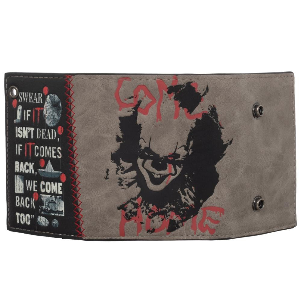 Black, red and white IT wallet with screen printed Pennywise artwork and text, with snap closure and chain with loop.