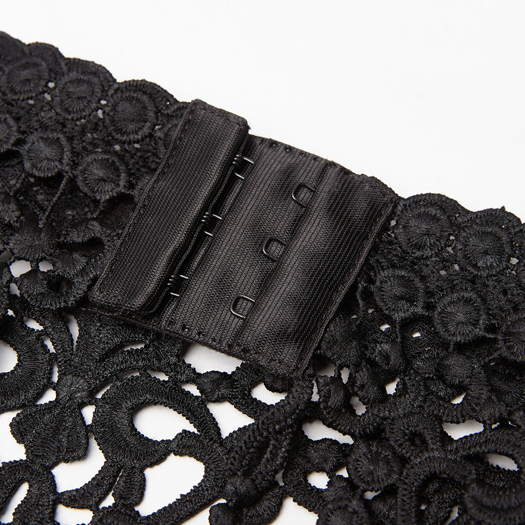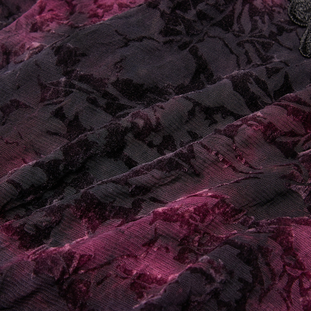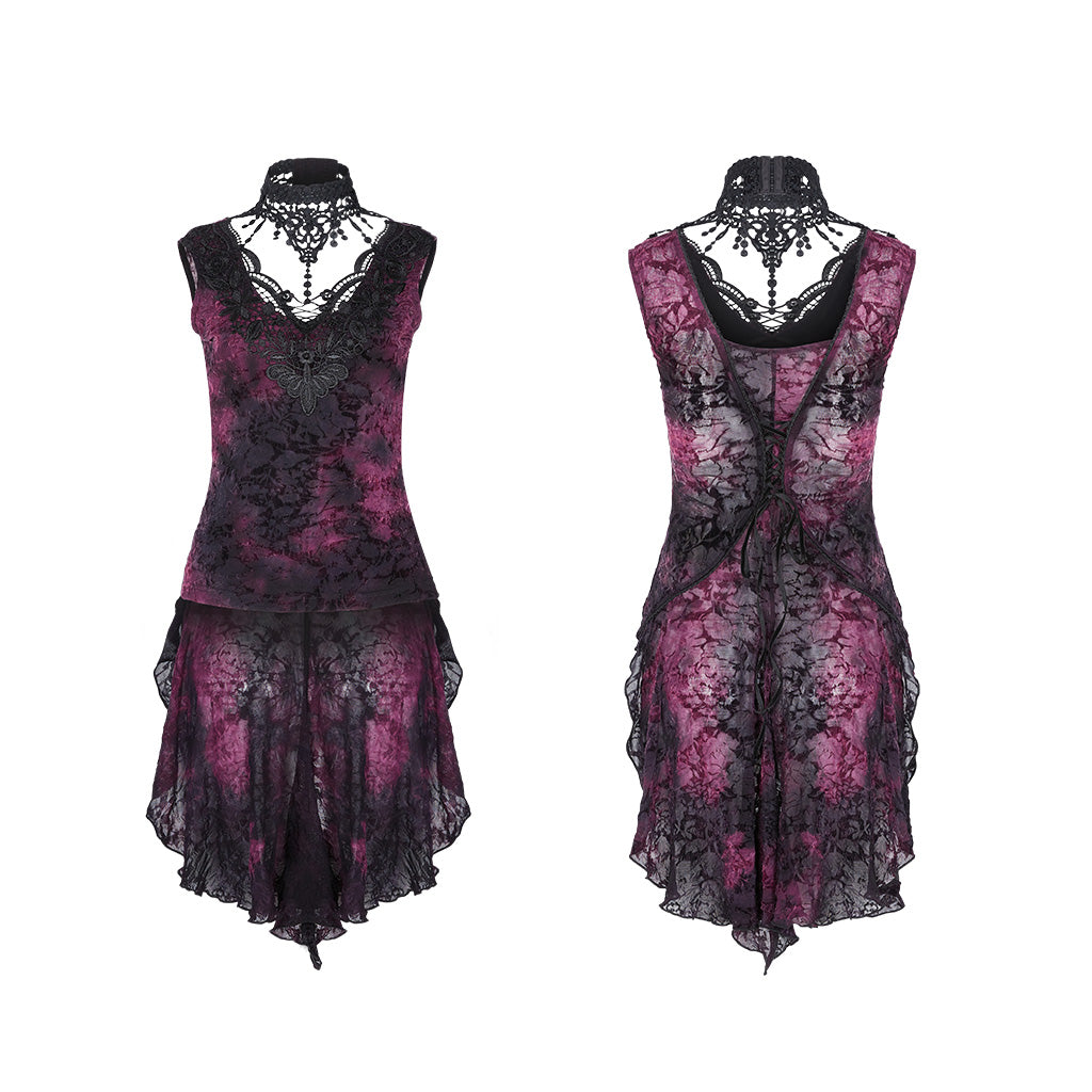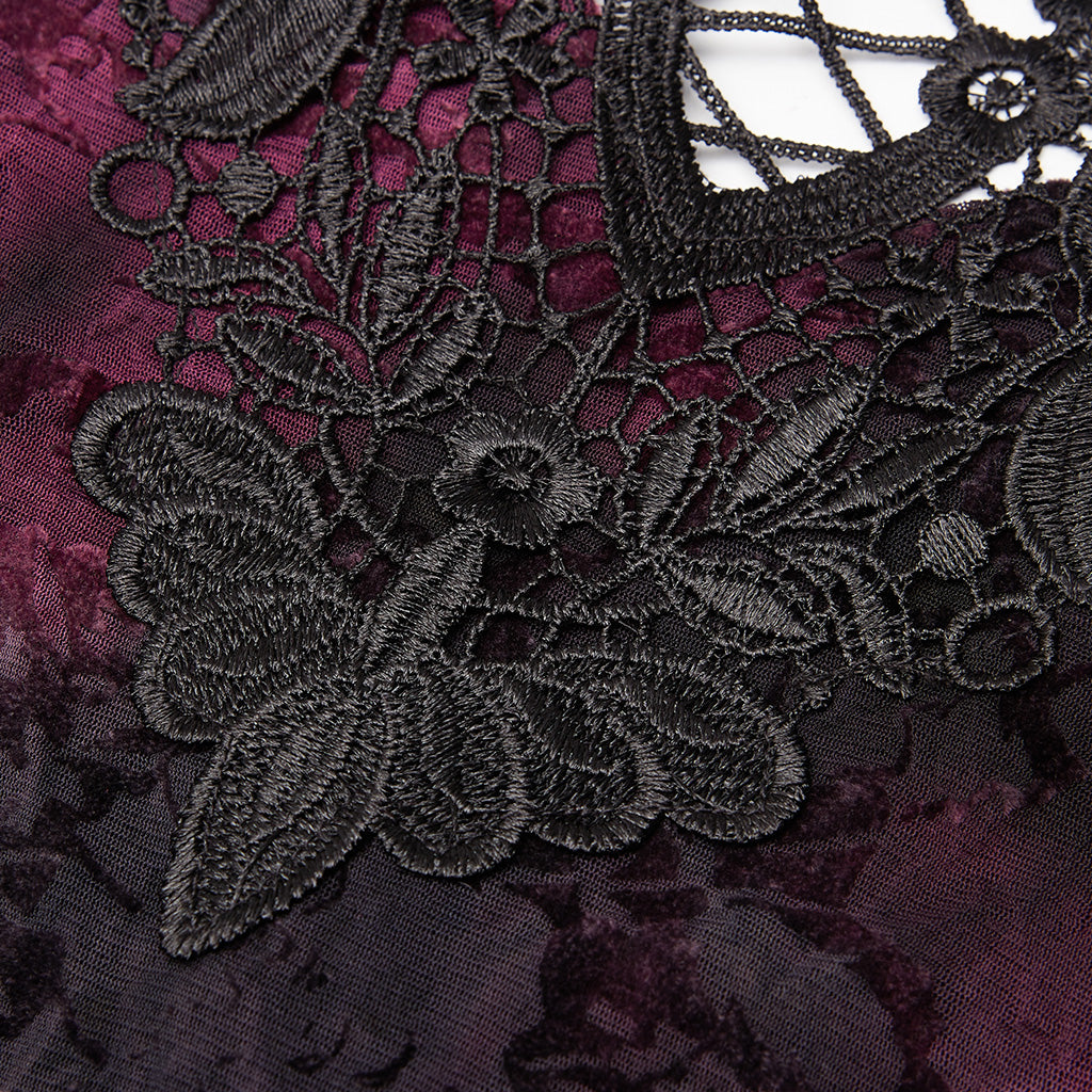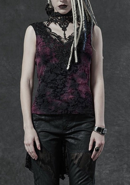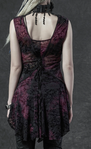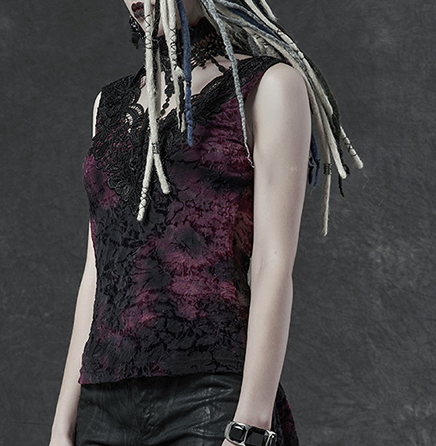 Long violet sleeveless top with elastic flocking network knitted fabric. Lace fabric collar is attached to the shirt, and adjustable at the back. Shirt has a big wave design hem.