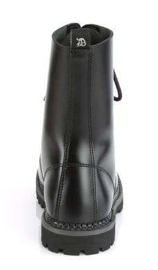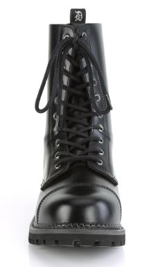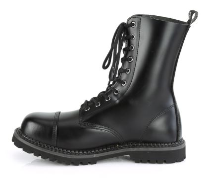 Black 10 eyelet unisex leather steel toe lace-up ankle boot. Boot has rubber sole. Full lace-up boot, no zipper.