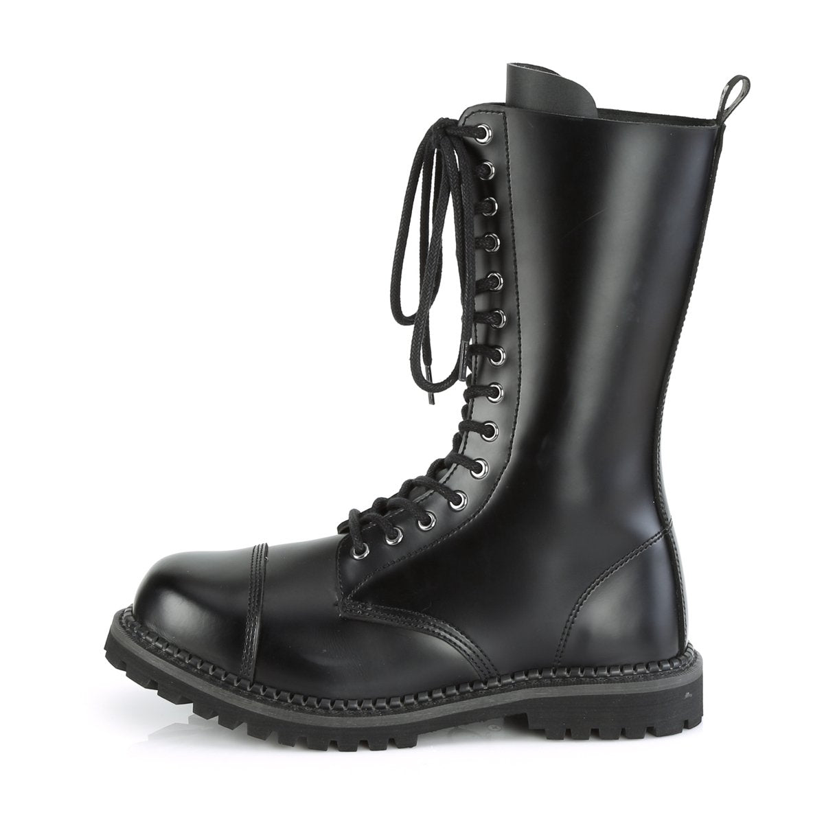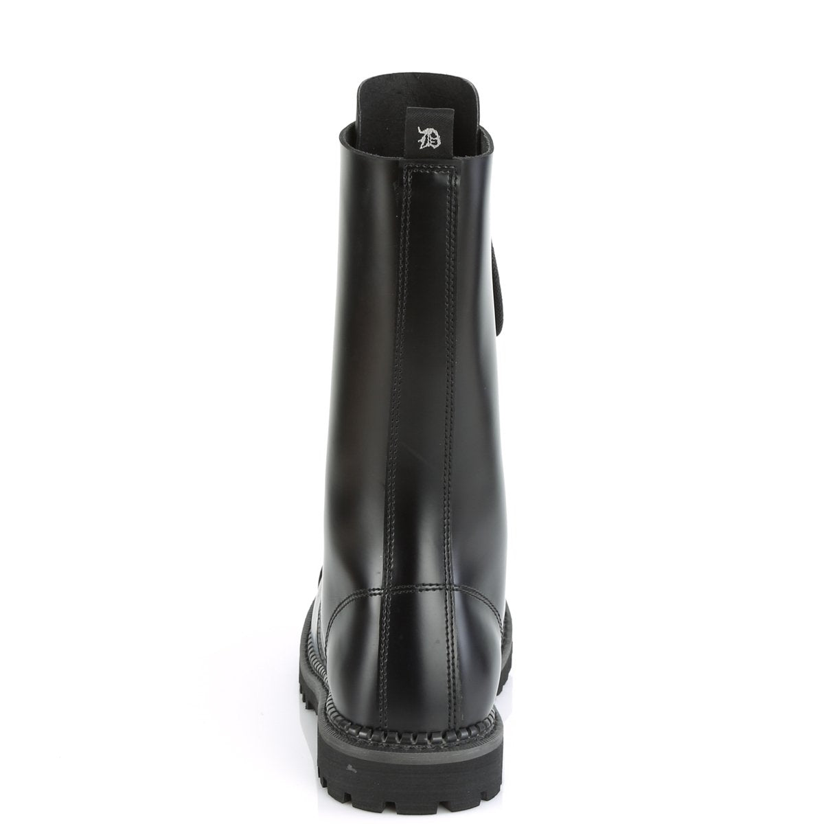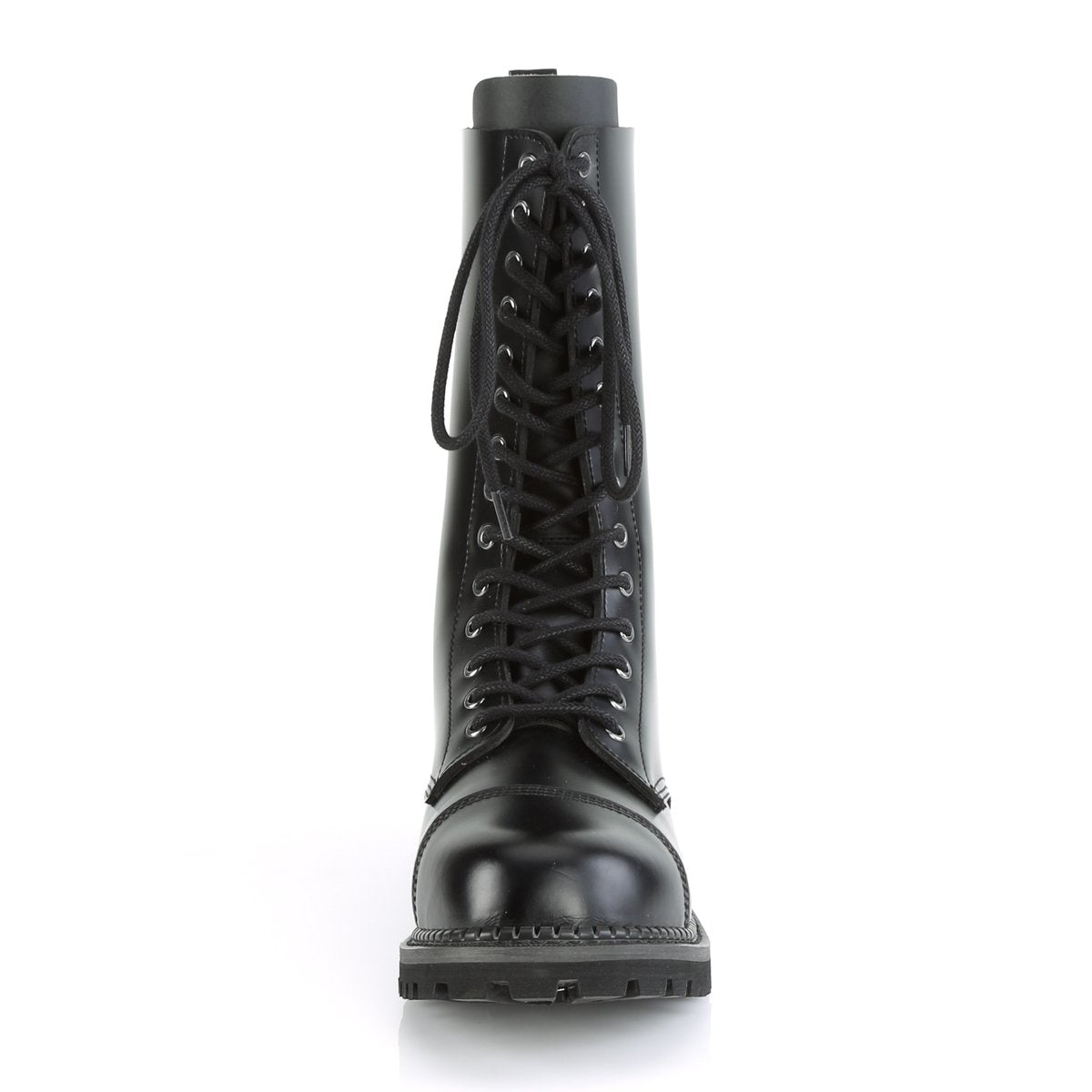 Black 14 eyelet unisex leather steel toe lace-up ankle boot. Boot has rubber sole. Full lace-up boot, no zipper.