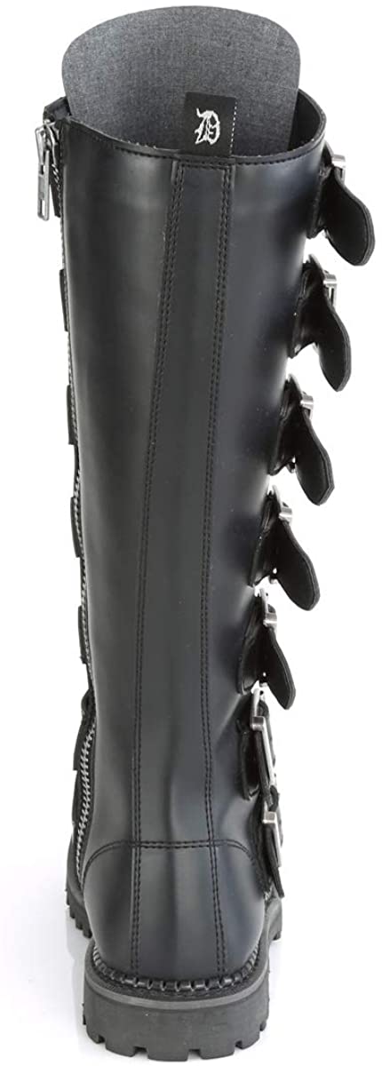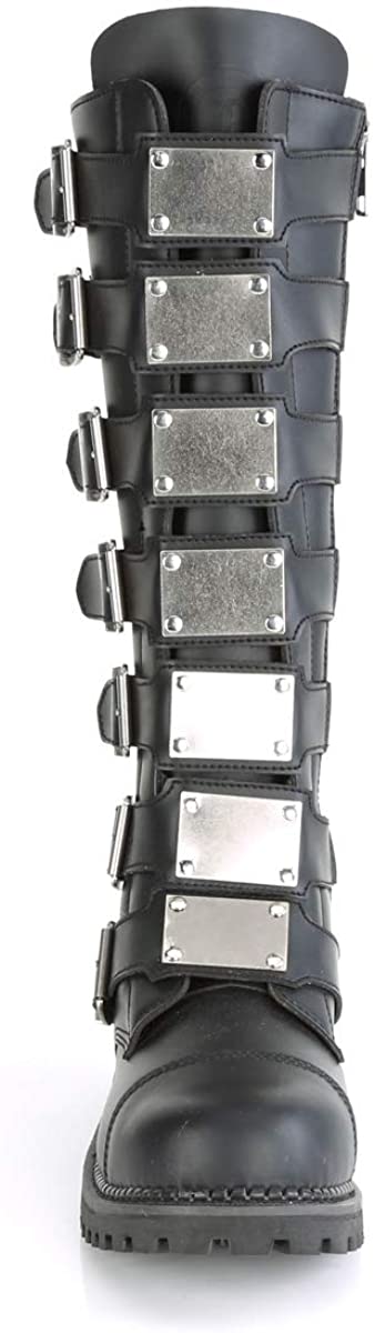 Black 21 eyelet unisex leather steel toe lace-up ankle boot. Boot has rubber sole and full length inside zip closure. Boot has 7 adjustable buckles that go over the laces, and 7 silver metal plates up the front.