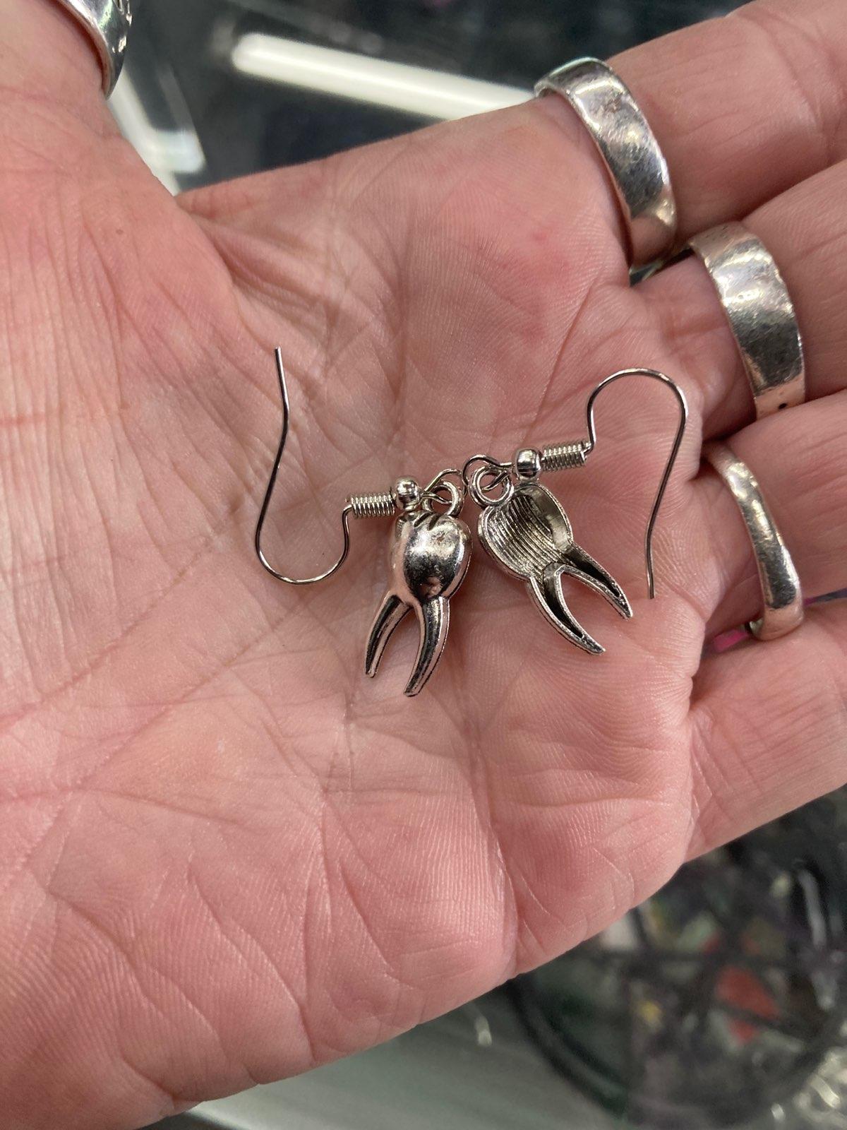 Hook earrings with hanging tooth charm.