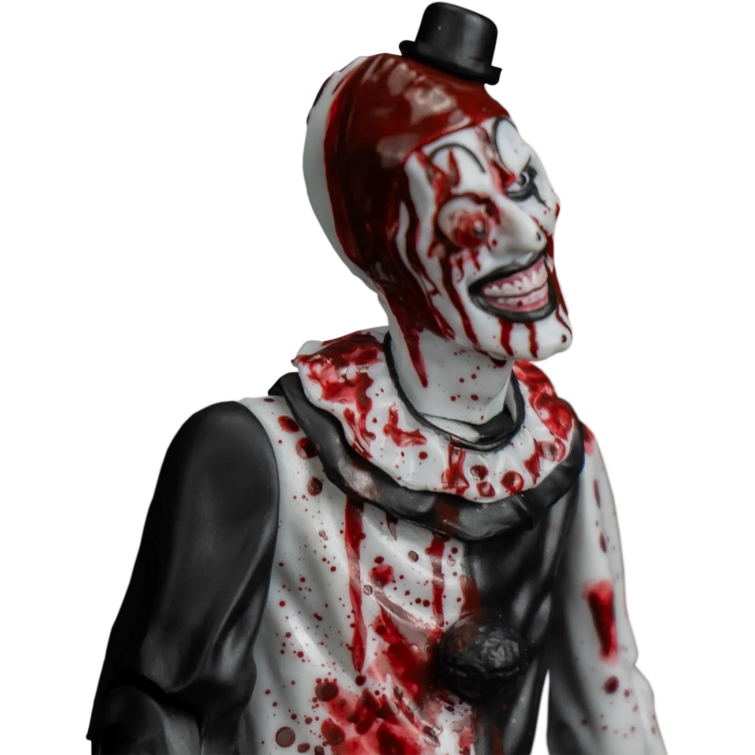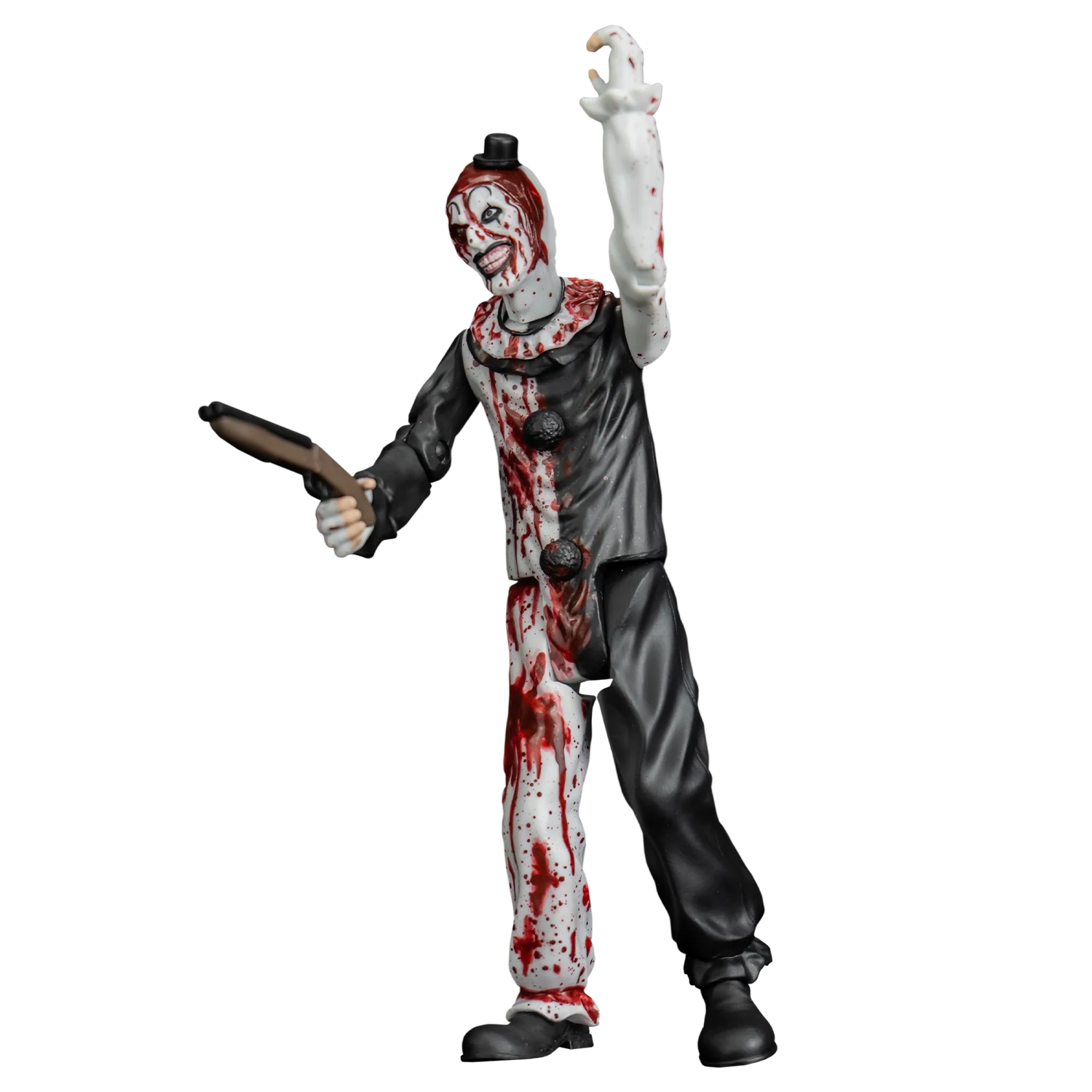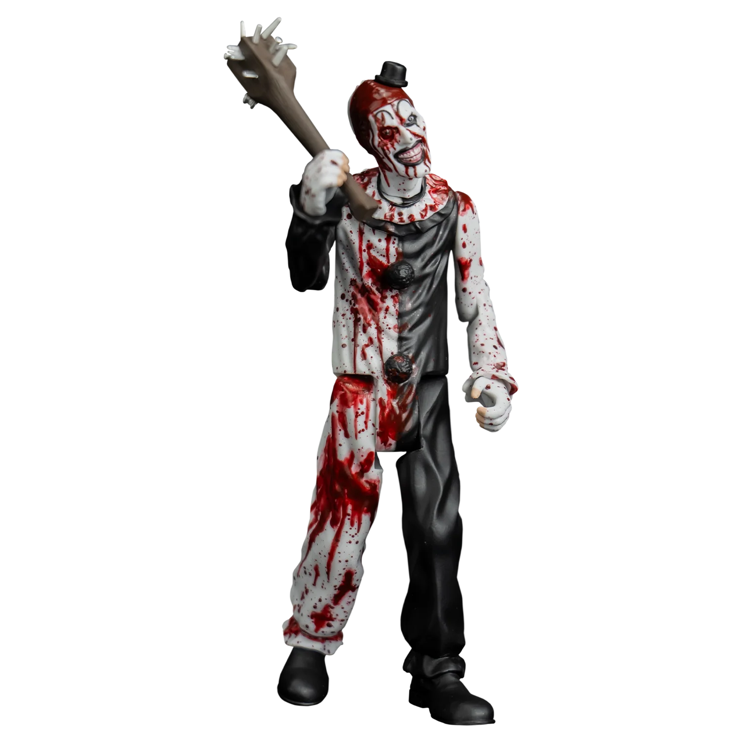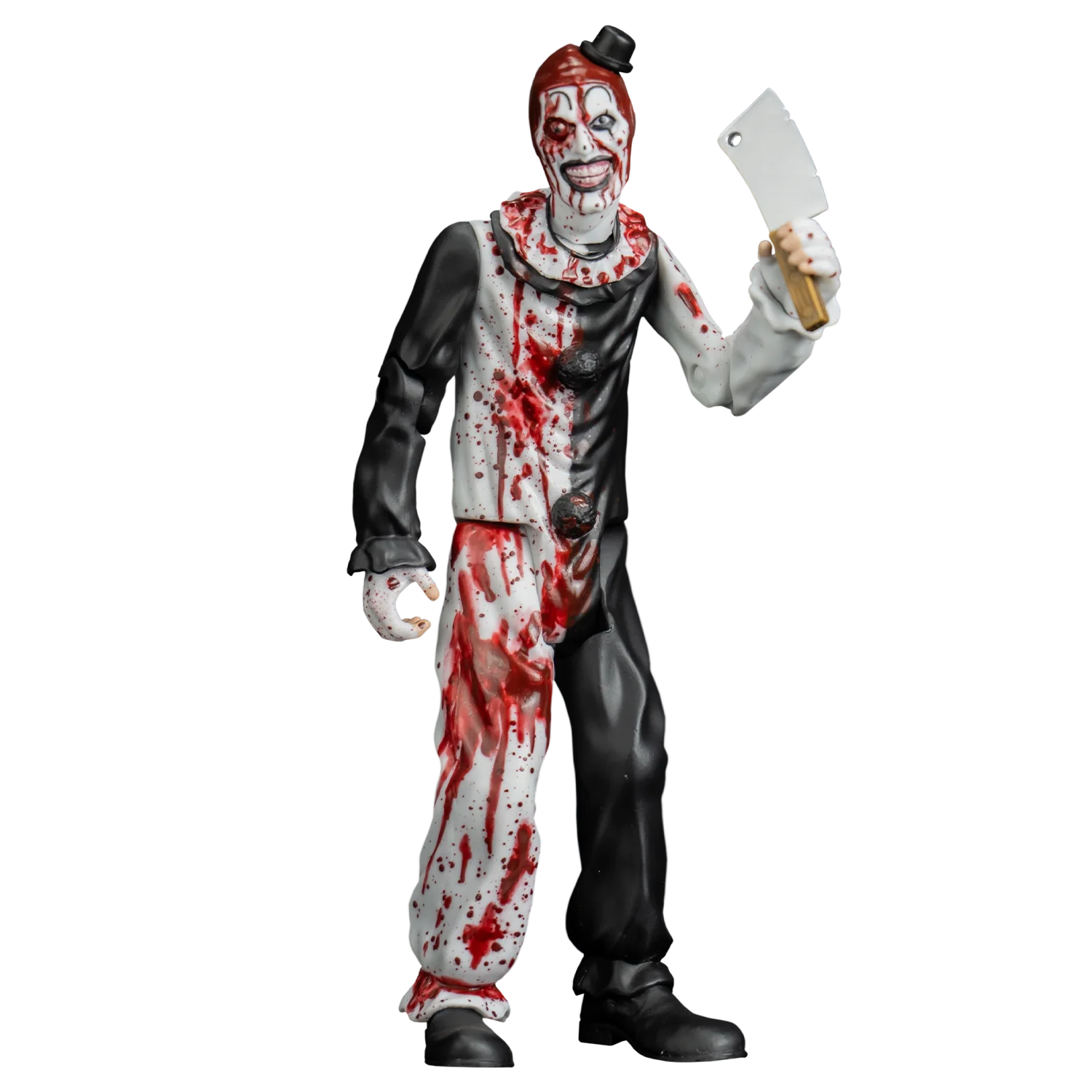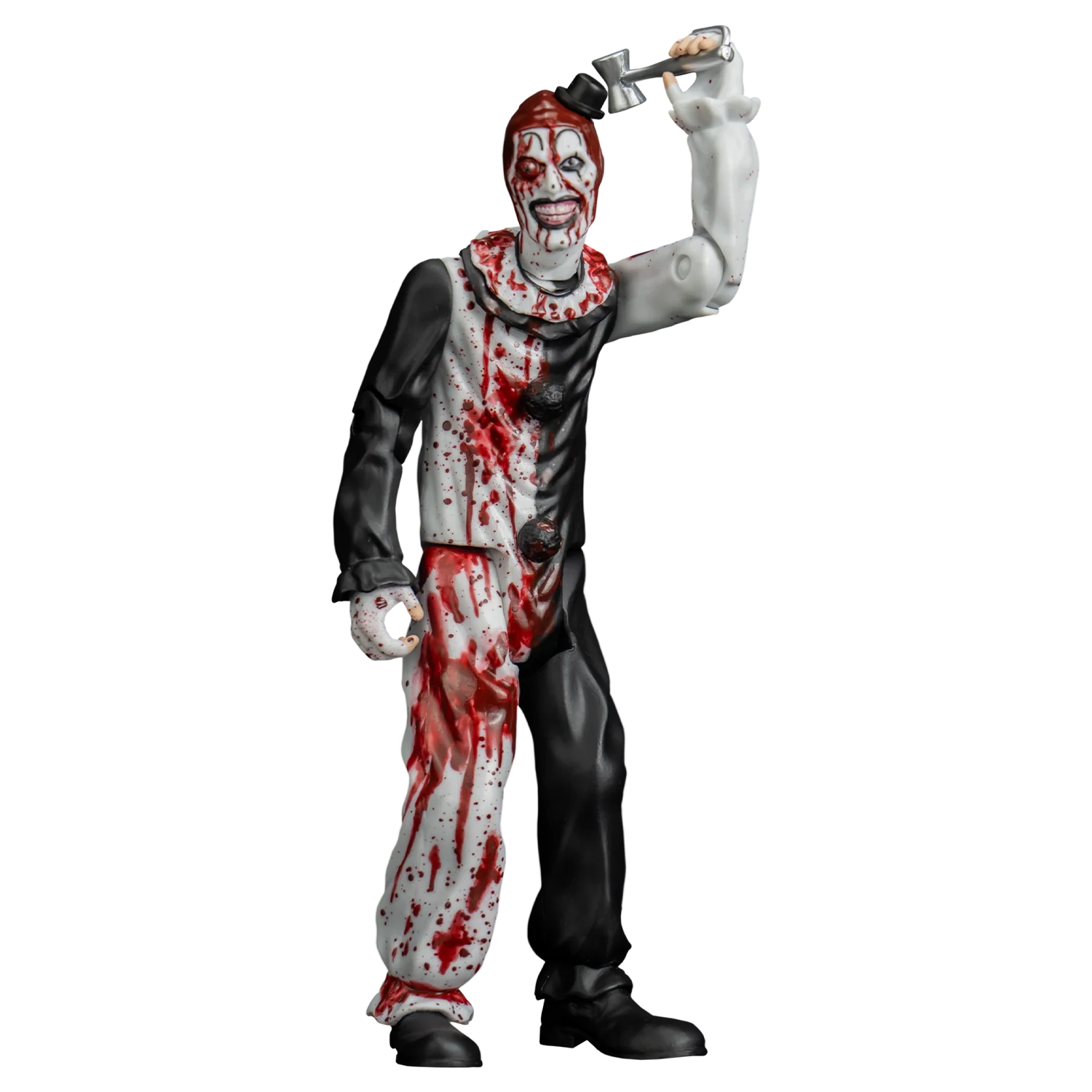 Art the Clown action figure. When back of head is pushed, his right eye pops out. Figure also comes complete with mace, cleaver, medical hammer and shotgun accessories. Packaged in a retro style box.