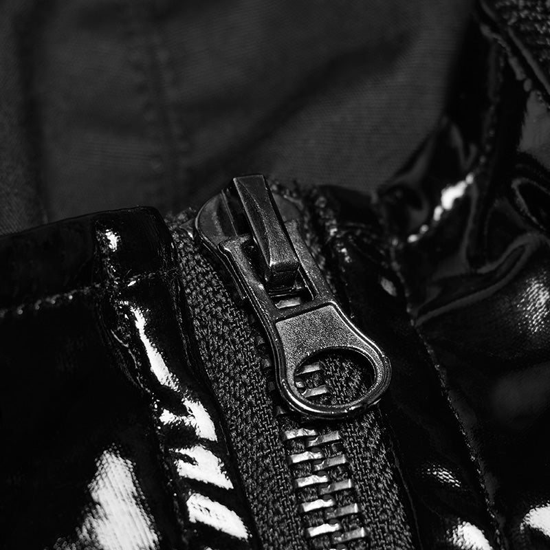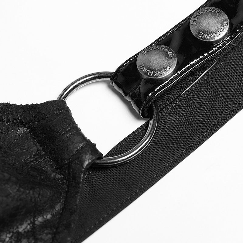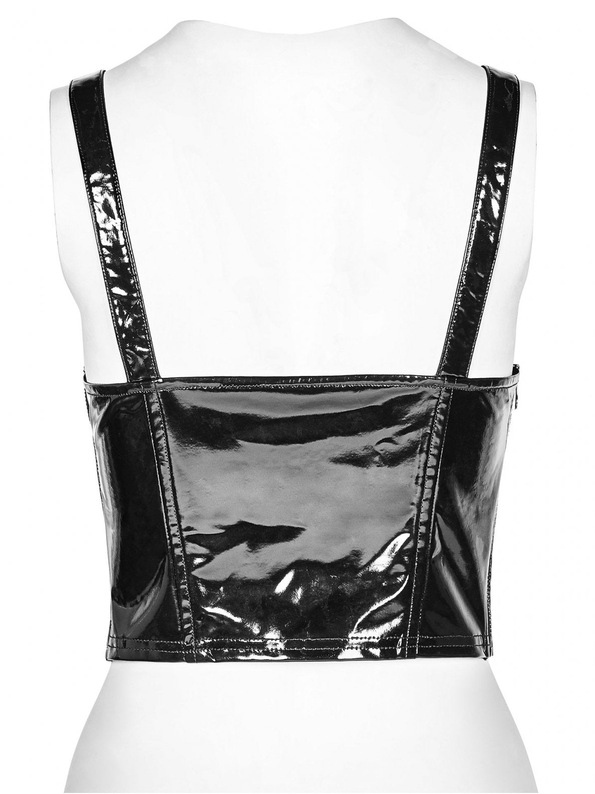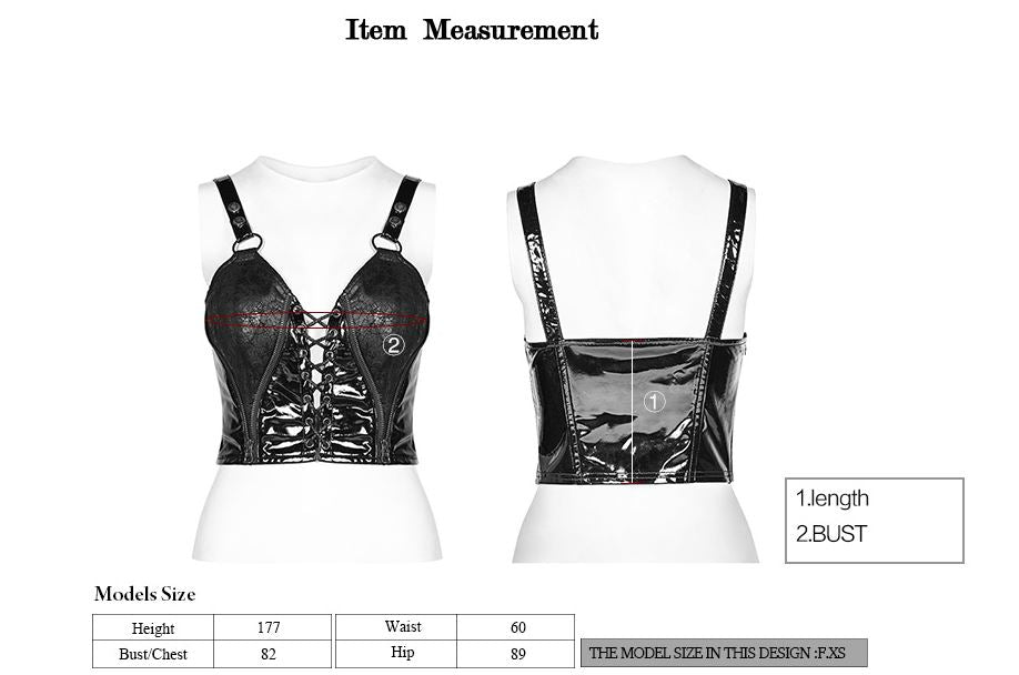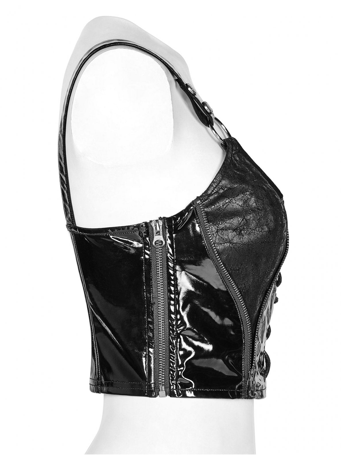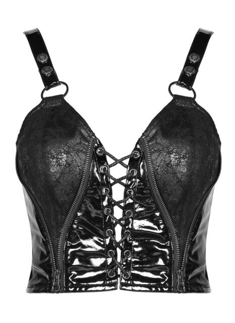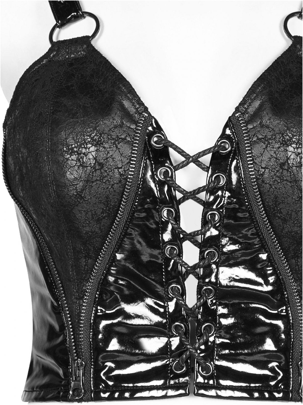 Black strappy vest style top with non-adjustable shoulder straps connected to the front with large O rings, front weathered leather zippered panel details, and front adjustable lace. Top has a right side zipper closure.